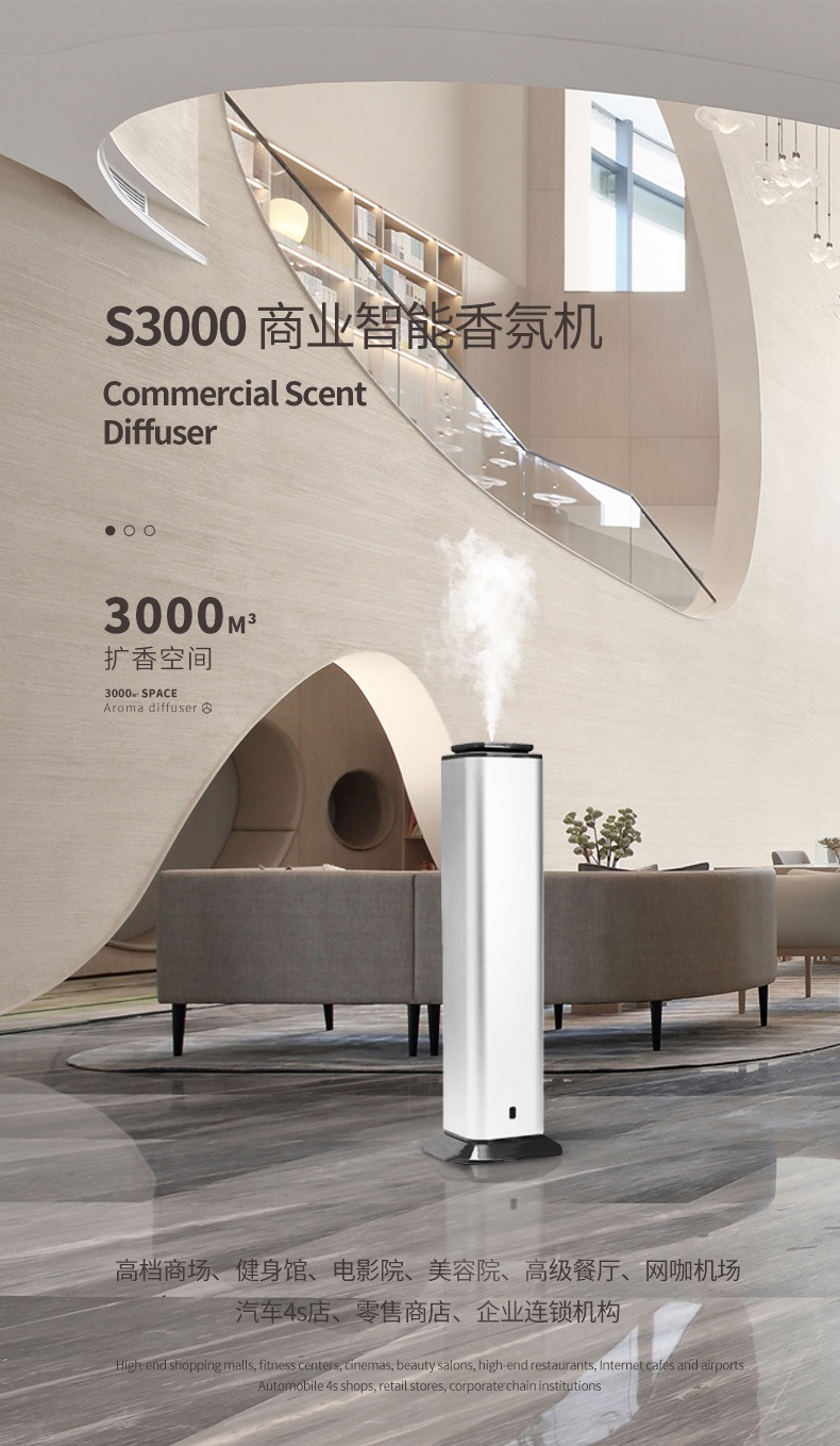 S3000外壳采用耐腐蚀PP材质+铝合金,耐划环保耐用;遥控控制更方便; 内置风扇,雾化香味迅速均匀扩散采用纳米级精油雾化,香气滞留时间更长,留香更久。